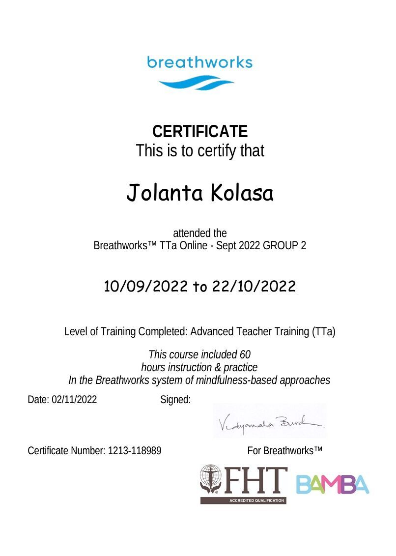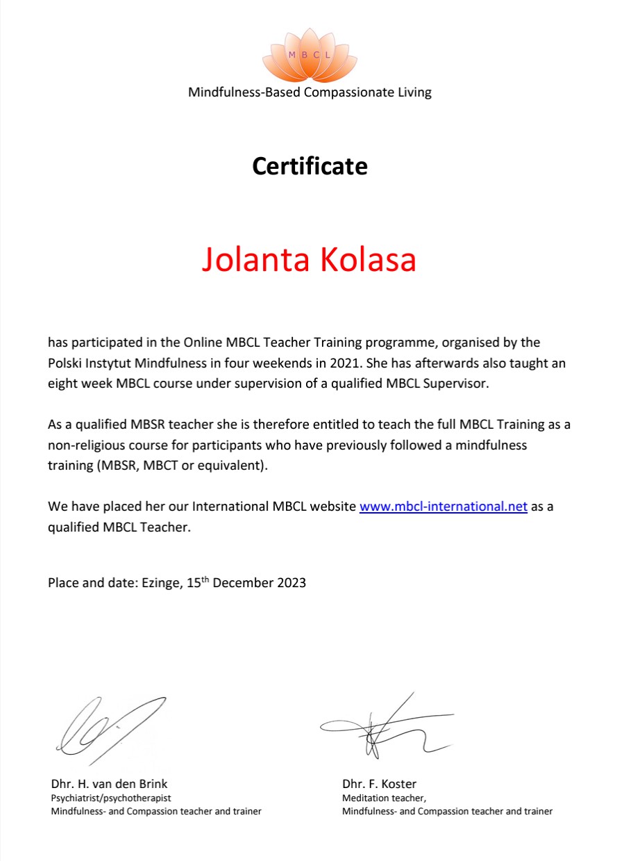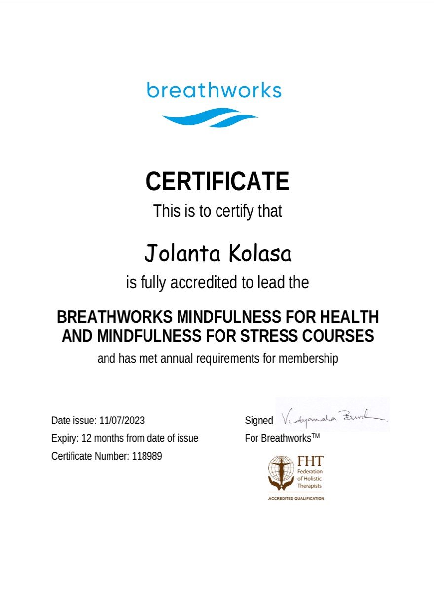 W 2023 roku ukończyłam dwuletni kurs trenerski i uzyskałam międzynarodowy certyfikat trenera Mindfulness w nurcie Breathworks w Wielkiej Brytanii. W tym samym roku ukończyłam także kurs trenerski programu „Życie ze współczuciem oparte na uważności” (ang. Mindfulness based Compassionate Living, MBCL). W 2024 roku uzyskałam certyfikat trenera programu „Uważność w komunikacji” (ang. Deepening Minfulness and Mindful Communication, DMMCTT).